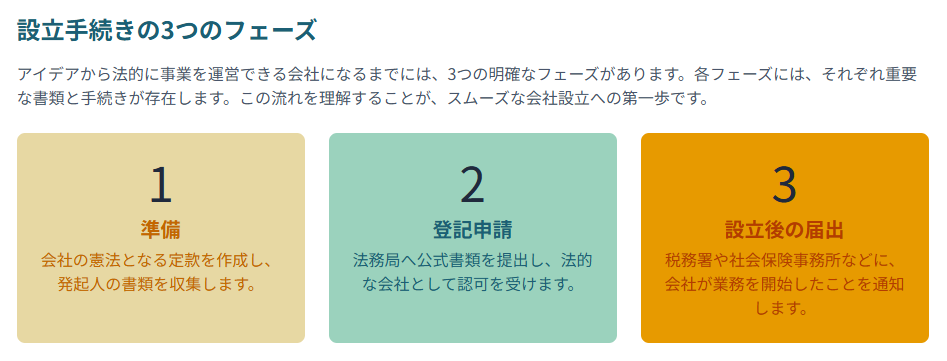 会社設立の手続きは、大きく分けて3つのステップで進みます。多くの方が「会社設立」と聞いてまず思い浮かべる法務局への登記申請(ステップ2)は、実はまだ中間地点(ステップ2)です。その前後のステップこそが、会社の土台を固め、将来の成長を左右する大切な期間となります。
