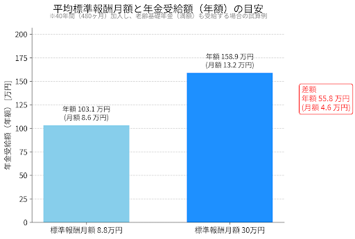 標準報酬月額8.8万円で30年間保険料を払い続けた場合、上乗せ部分である厚生年金は、月々わずか1.4万円ほどにしかなりません。誰もがもらえる基礎年金と合わせても、月額8.3万円。この金額で老後の生活を安心して送るのは、正直かなり厳しいと言わざるを得ません。