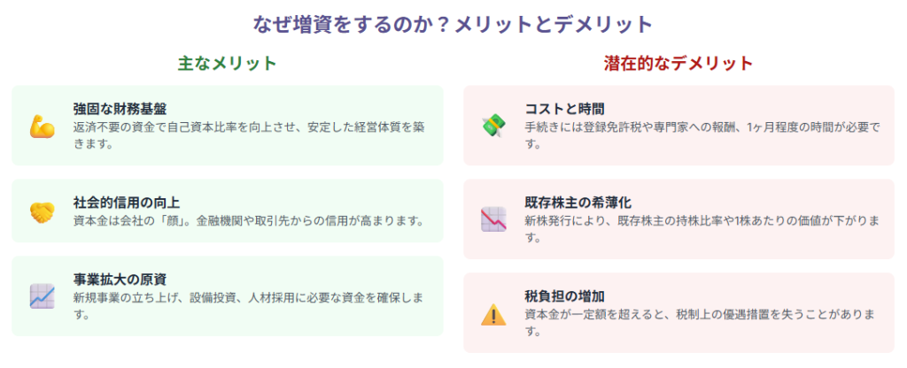 増資にはメリットだけでなく、慎重に考えるべきデメリットもあります。両方をしっかりと理解して判断することが大切です。