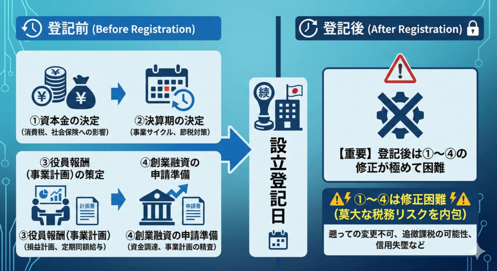 これらの経営戦略に関わる決定を専門家の支援なしで行い、設立「後」に初めて税理士に相談した場合、すでに「経営上の失敗」が確定しているケースがよくあります。