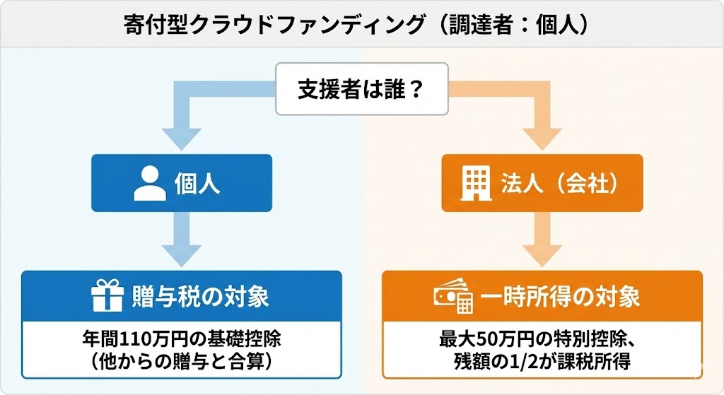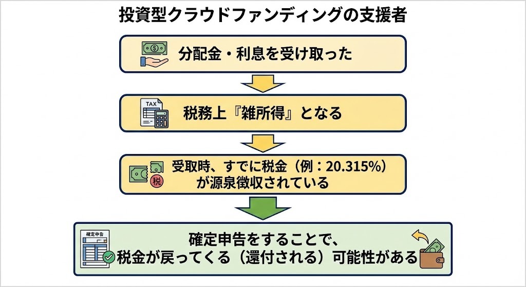 支援者が個人なら「贈与税」、法人なら「一時所得」と、税金の種類が変わります。 - 「投資型」(支援した人)は「確定申告」を