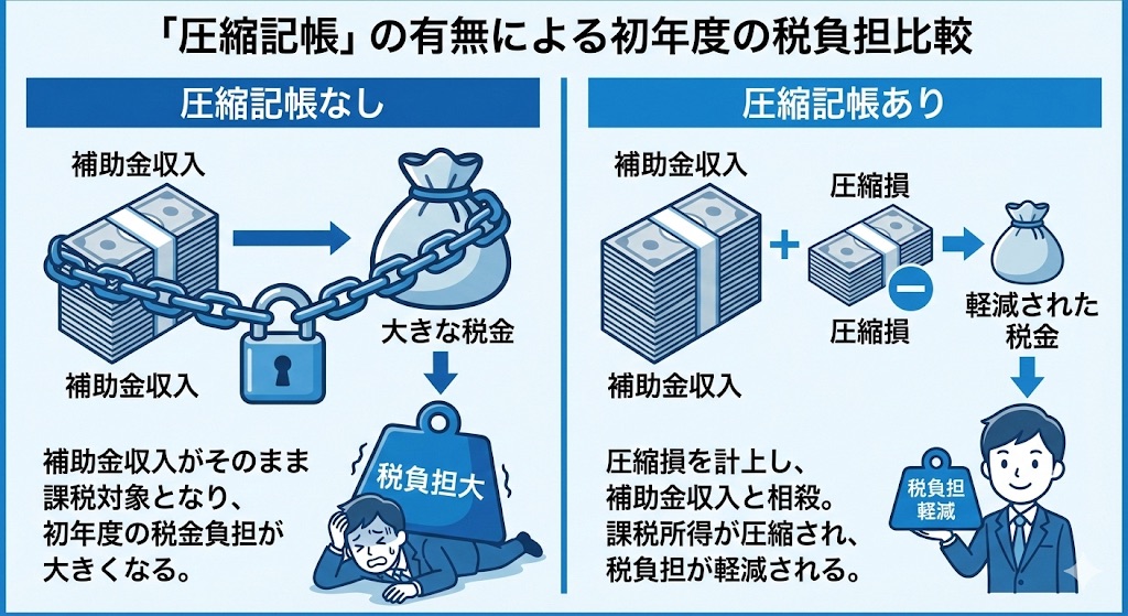 この処理を行うことで、補助金として入った収入と、「圧縮損」という費用が相殺され、補助金を受け取った年の税金がかかる利益を減らすことができます。これにより、最初の年の税金負担を軽くし、補助金が持つ効果を最大限に活かすことが可能になります。
