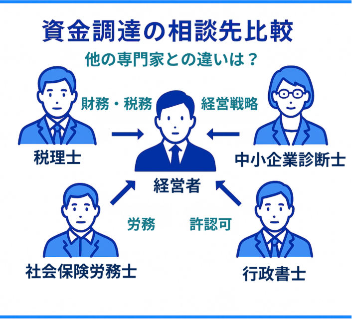資金調達の相談先として、税理士以外にも様々な専門家が候補に挙がります。それぞれの専門家との役割の違いをみていきましょう。