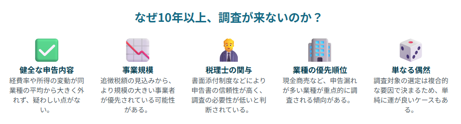 この記事を最後まで読めば「10年以上調査が来ない」本当の理由と、そこに潜むリスク、そして「いつ来ても大丈夫」な安心の体制を今から作る方法が分かります。