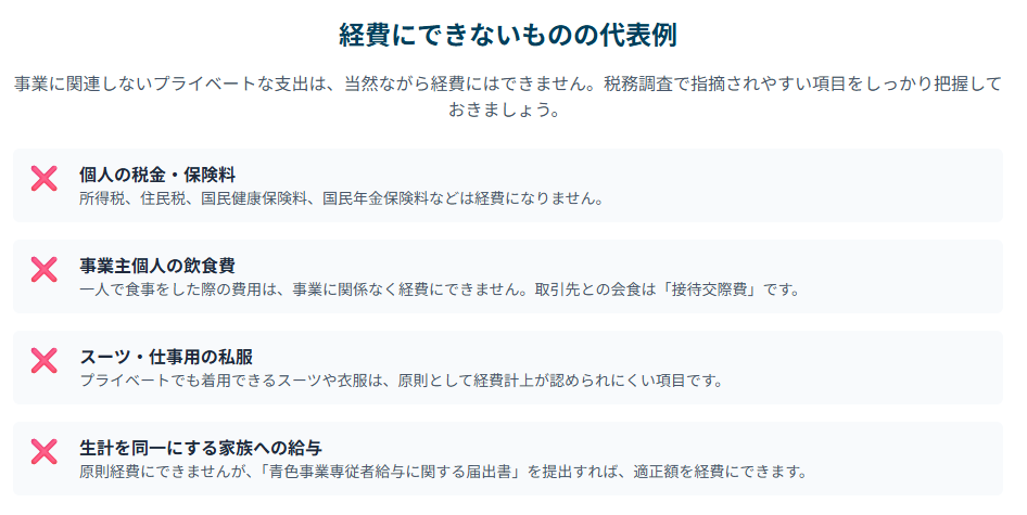 これらは、事業とは関係のないプライベートな支出と見なされるため、経費にはできません。