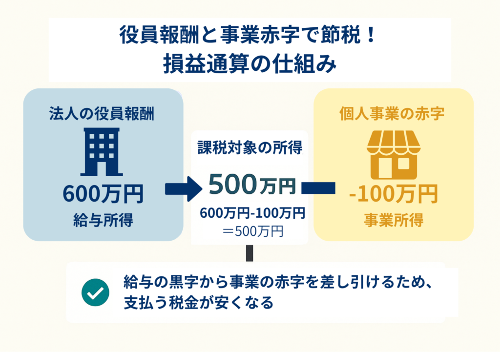この場合、給与の黒字600万円から、事業の赤字100万円を差し引いた、残りの500万円に対してのみ税金がかかるため、結果として大きく税金を抑えることができるのです。(※所得控除等の説明は割愛しております。)