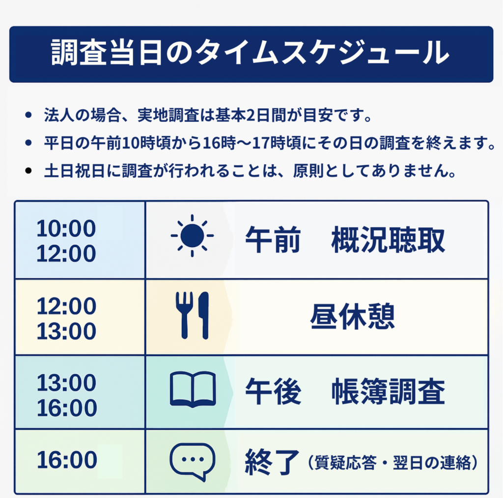 会社の場合は、帳簿や取引が複雑なため2日間が標準とされています。一方、個人事業主や小規模な事業者の場合は、調査対象となる資料が比較的少ないため、1日で終わることがほとんどです。