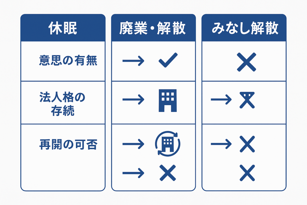 | 項目 | 休眠 | 解散・廃業 | みなし解散 |